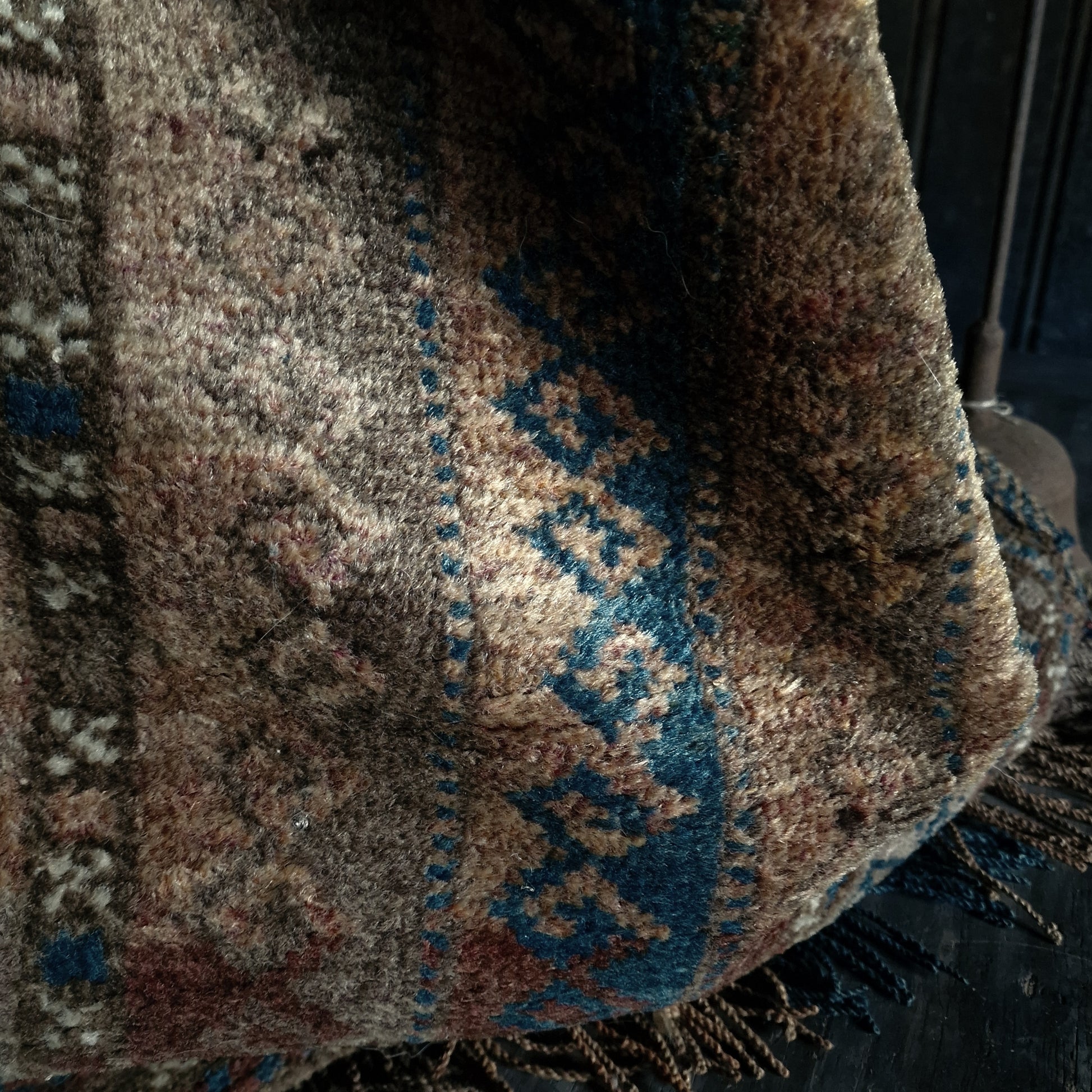 De verweerde structuren en ingetogen kleuren geven dit textiel zijn tijdloze uitstraling.