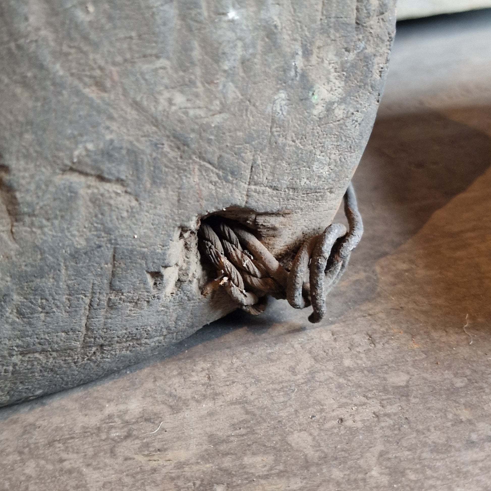 Deze oude koebel uit China is een prachtig stuk volksambacht. Het massieve, doorleefde hout toont diepe nerven en natuurlijke scheuren die zijn leeftijd en verleden prijsgeven.
