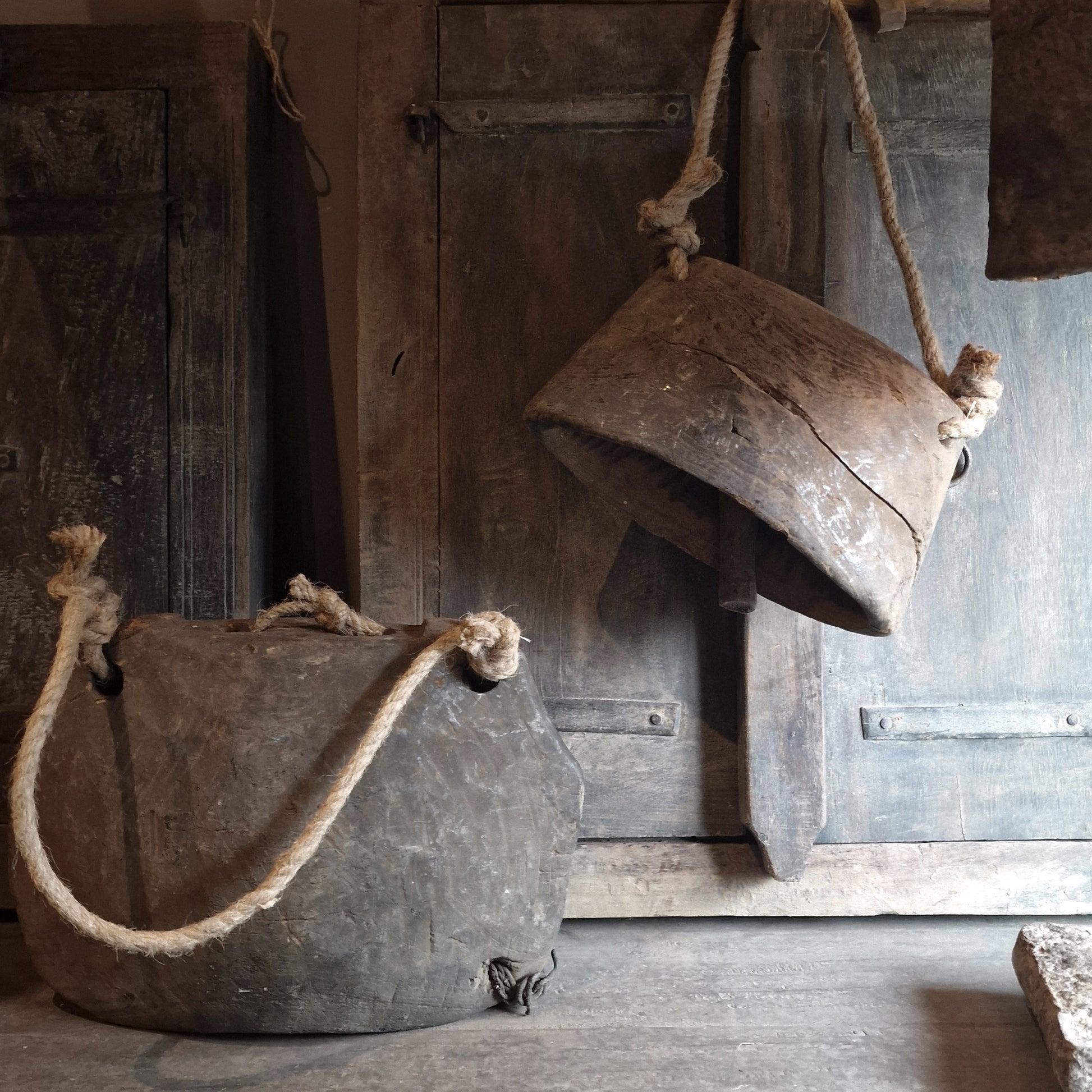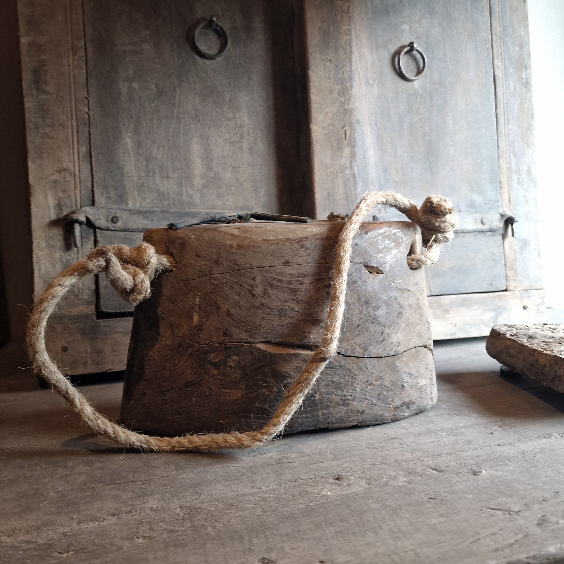 Deze unieke oude koebel uit China is een prachtig stuk volksambacht. Het massieve, doorleefde hout toont diepe nerven en natuurlijke scheuren die zijn leeftijd en verleden prijsgeven.