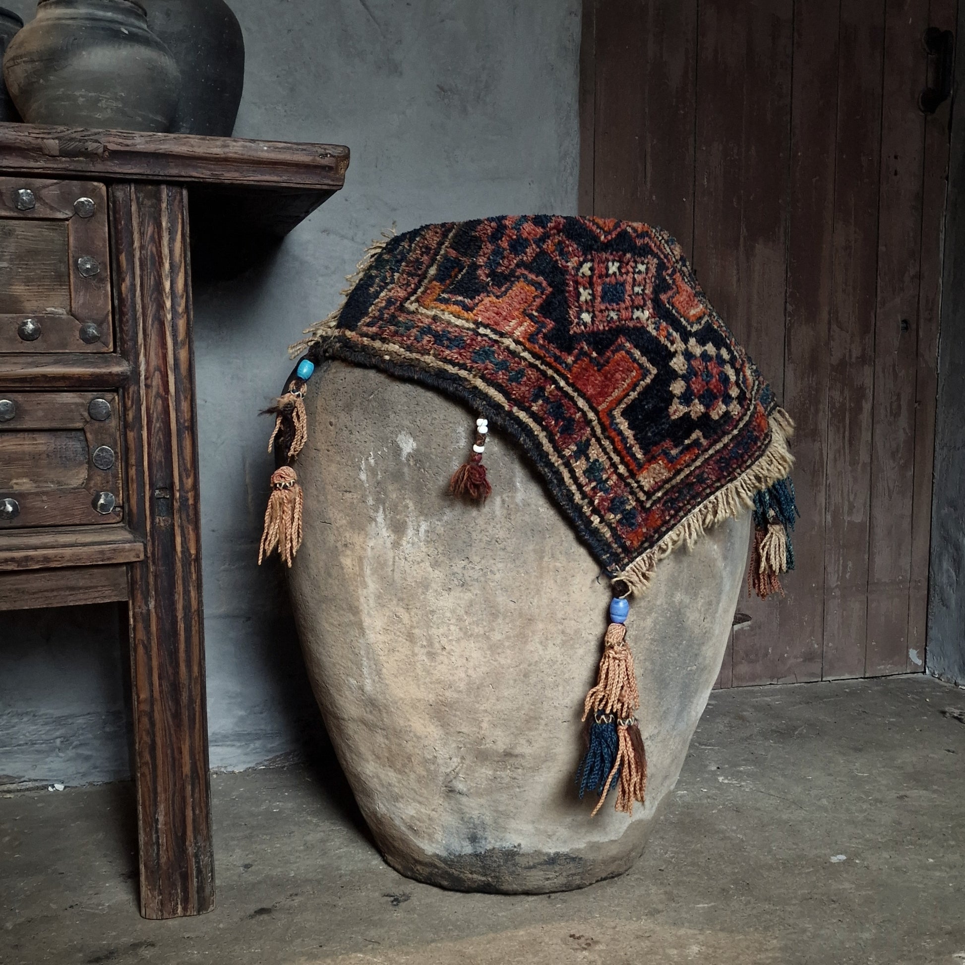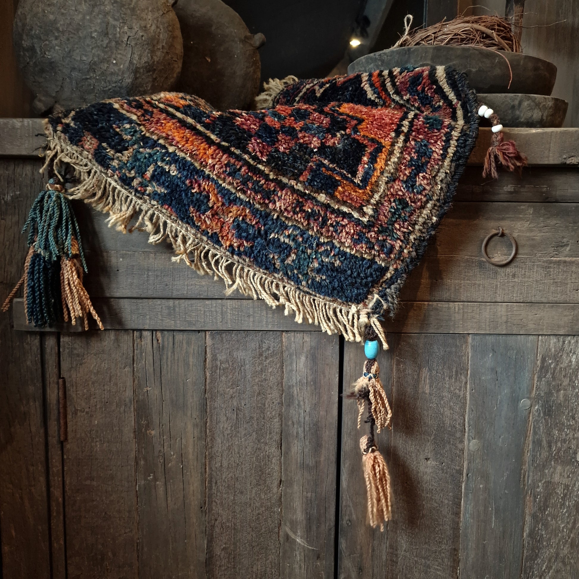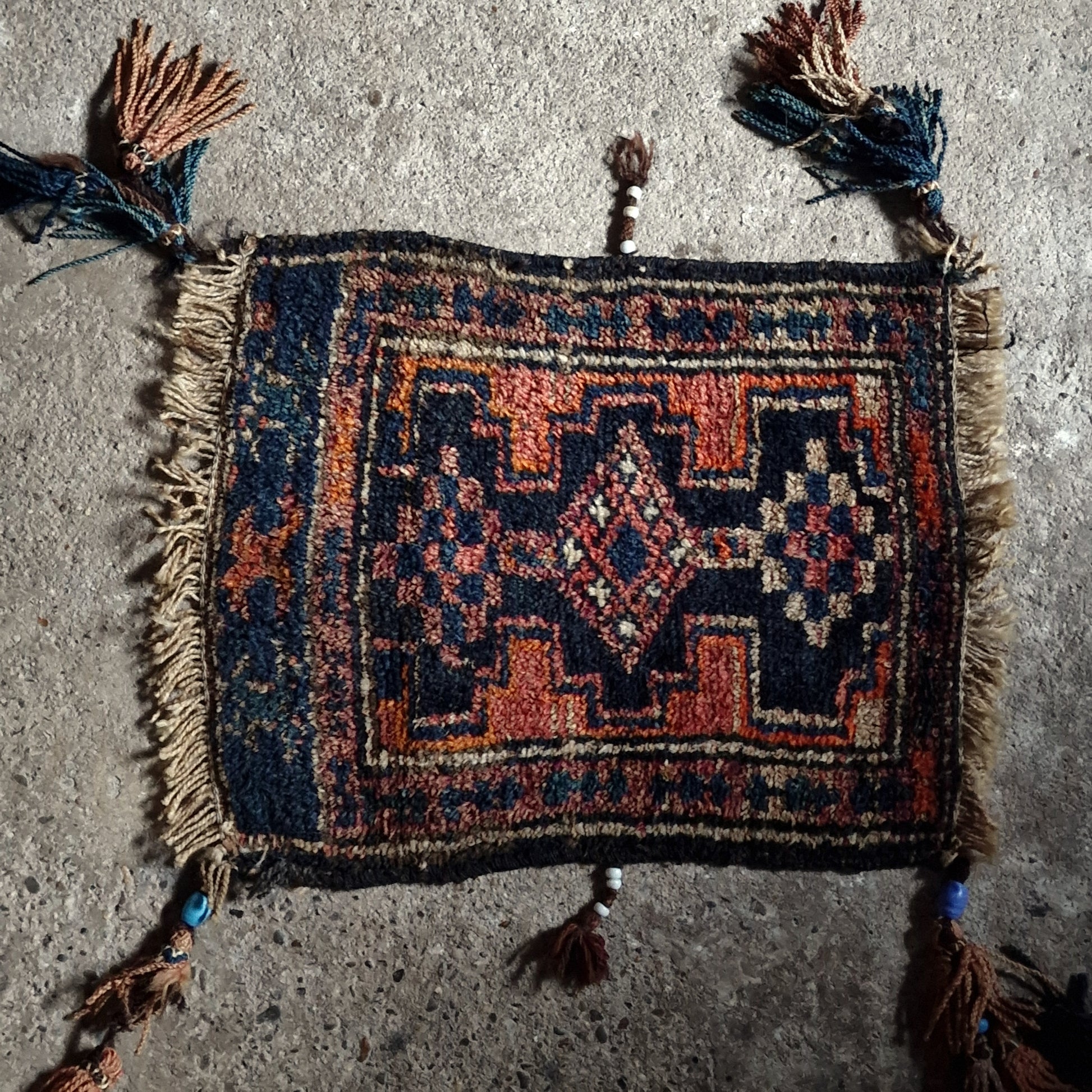 Dit is een klein, handgeknoopt Perzisch tapijtje met een warme, diepe kleurstelling in nachtblauw, roest-oranje, oudrood en zandtinten. De randen zijn afgewerkt met grove wolfranjes en aan de hoeken hangen decoratieve kwasten met kralen Dit is typisch voor tribale nomadische weeftradities uit West- of Zuid-Iran, mogelijk uit de regio van de Qashqai- of Bakhtiari-stammen.