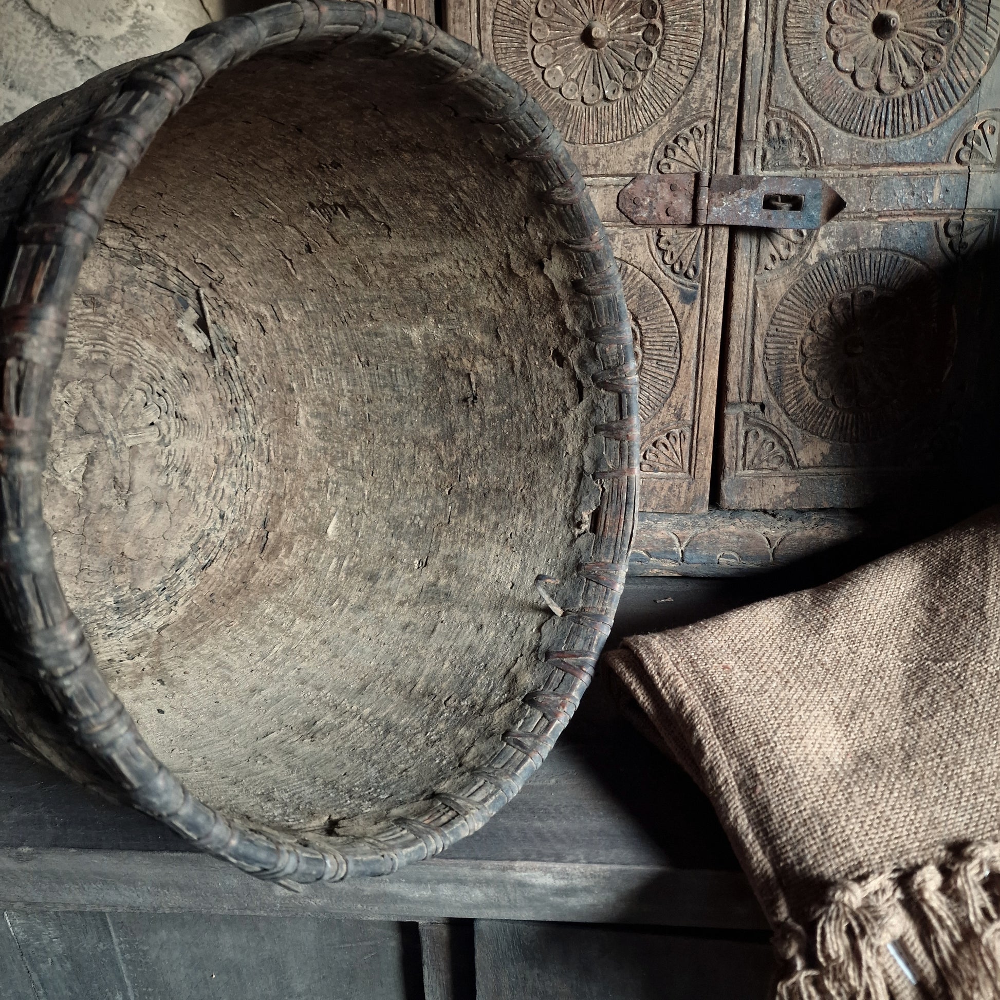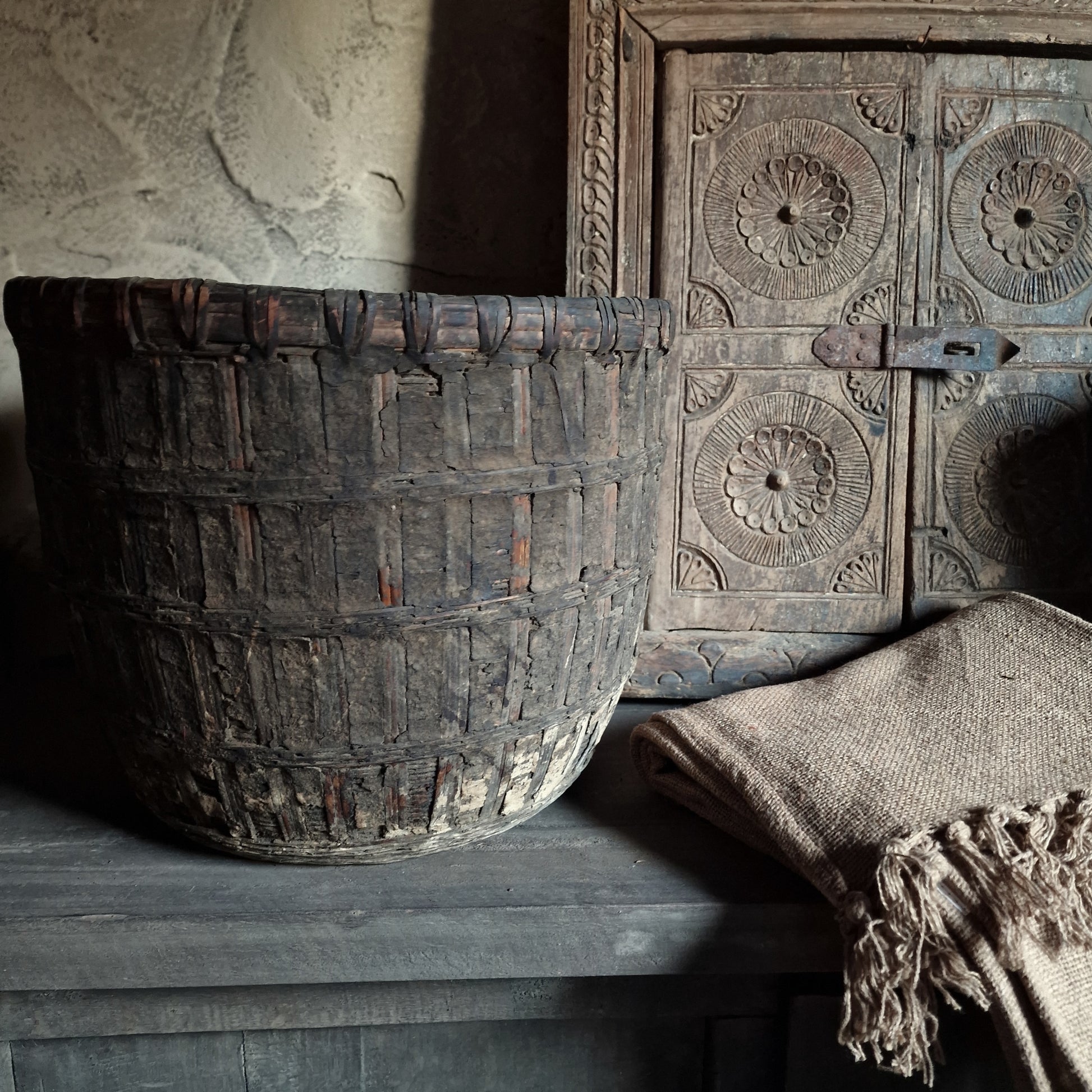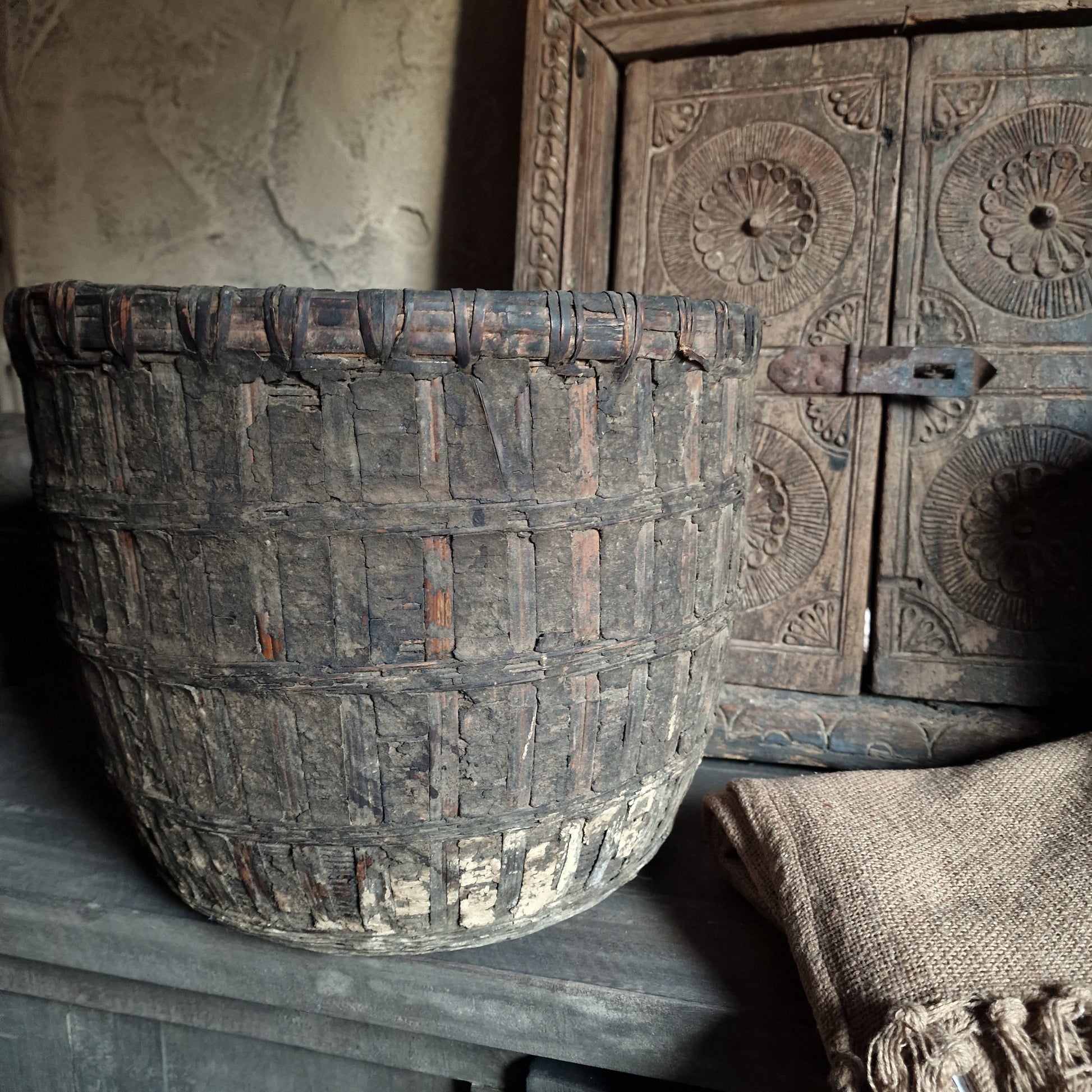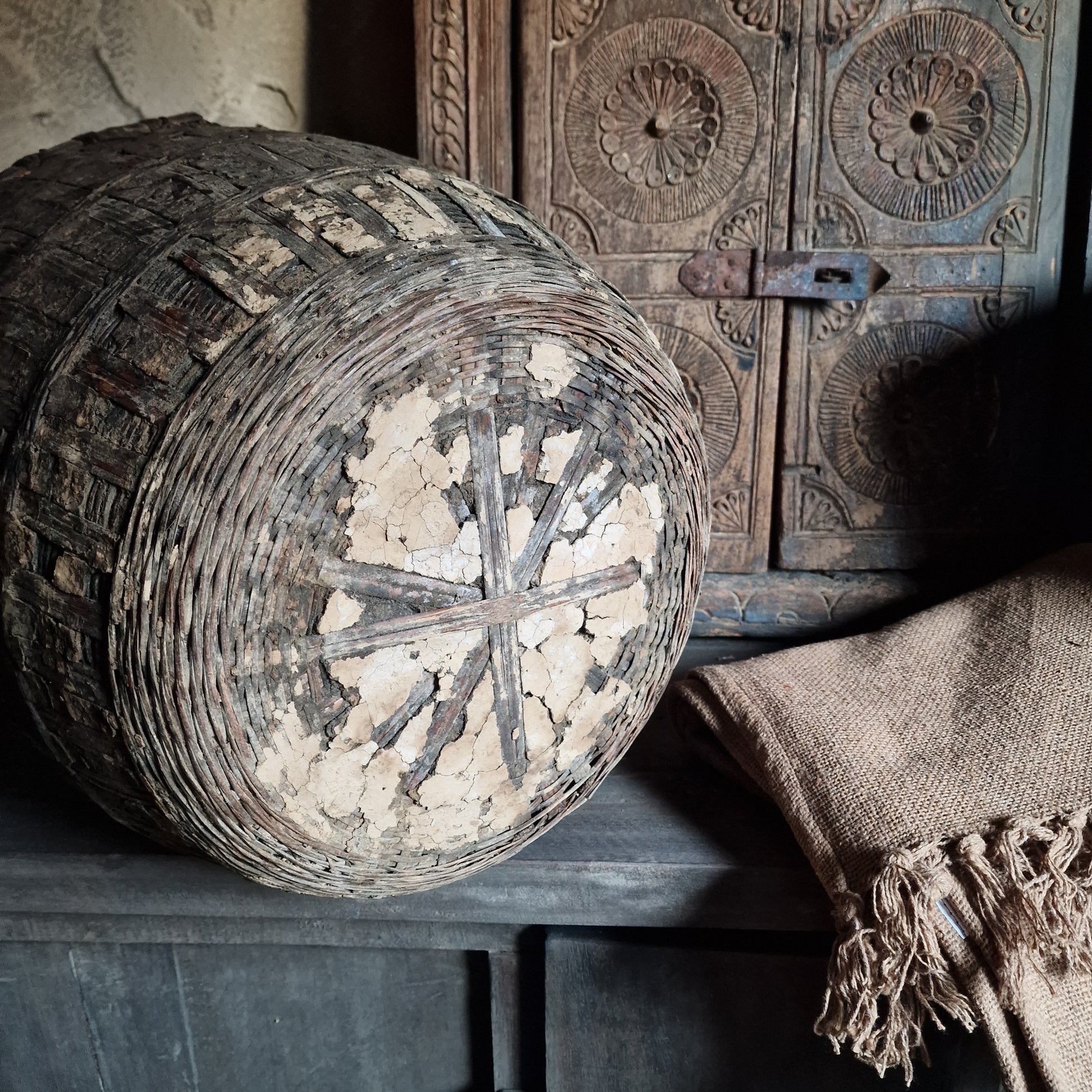 Oude rieten mand met leem