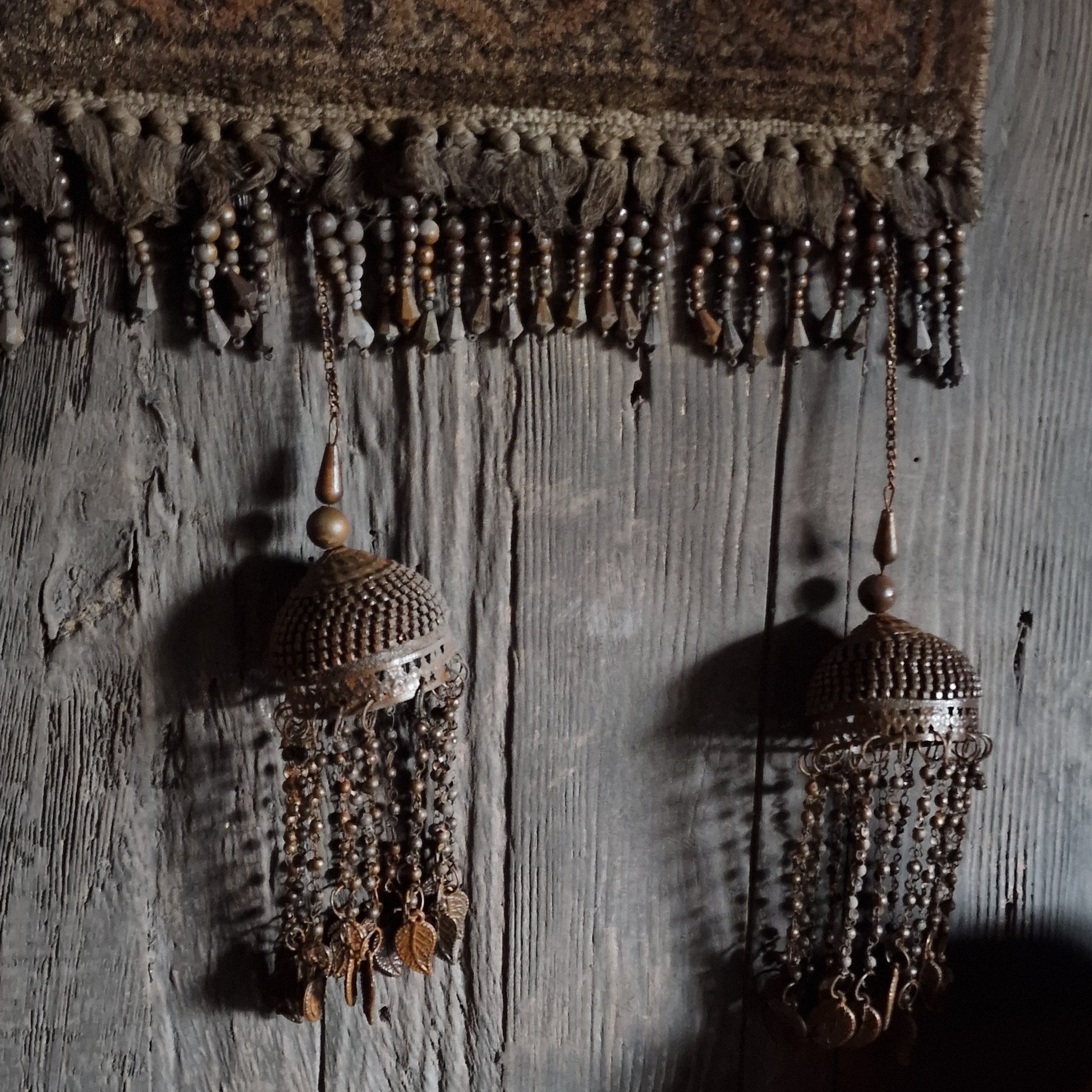 Langs de onderzijde loopt een rij oude franjes en kralenaccenten, die fraai doorlopen in drie decoratieve metalen kwasten. Deze gedetailleerde, etnische ornamenten versterken het ambachtelijke en nomadische gevoel van het geheel.