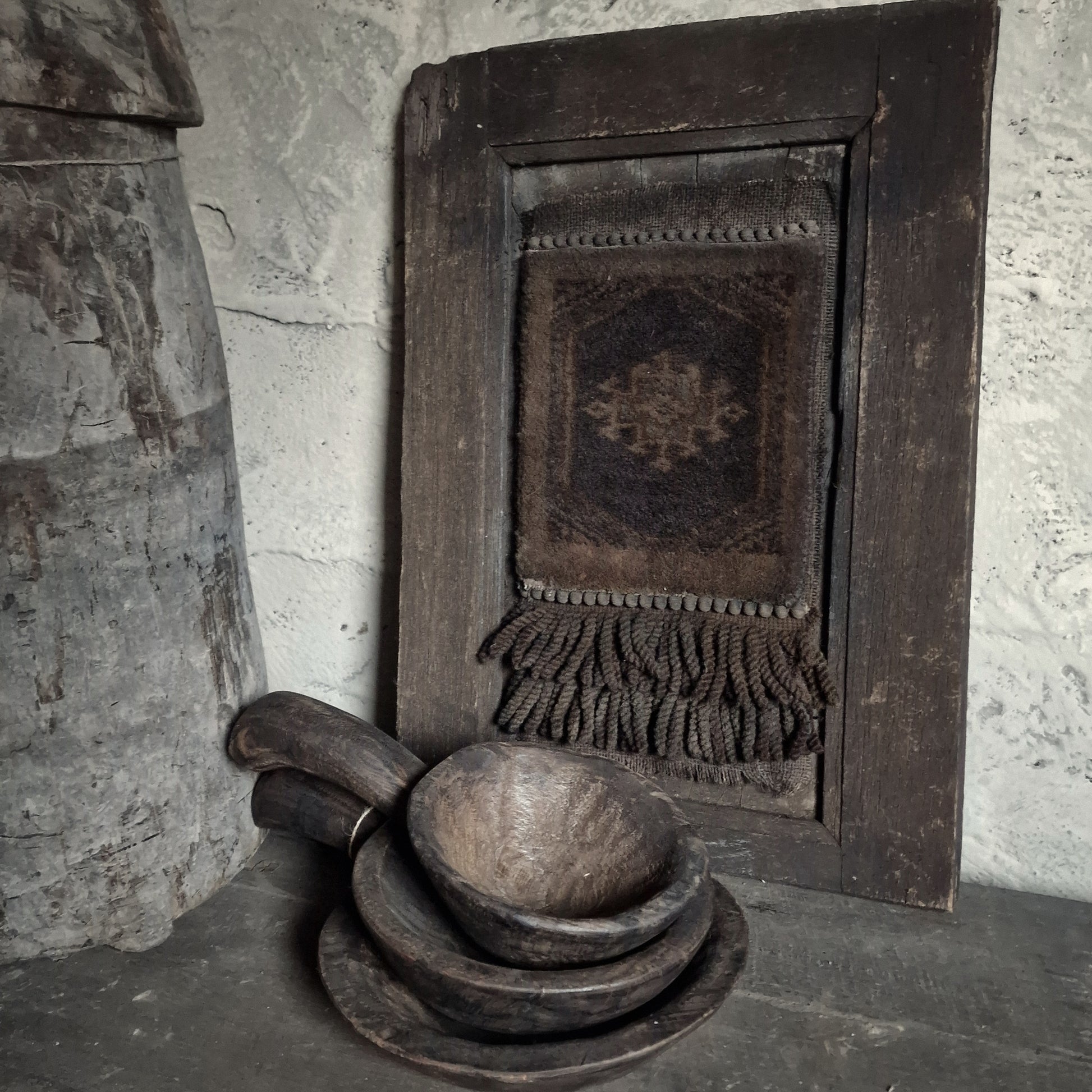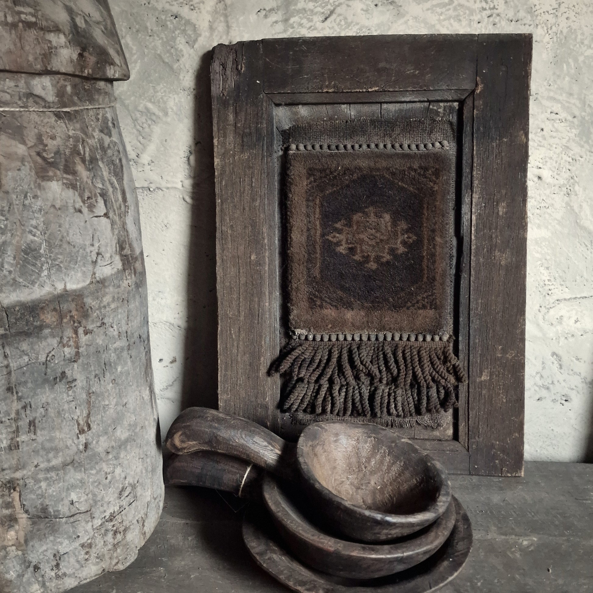 Dit authentieke uniek houten paneeltje is voorzien van een klein Perzisch tapijtje in warme, diepe bruintinten. Het verweerde houten paneeltje met zichtbare gebruikssporen geeft het stuk een doorleefd en karaktervol uiterlijk.