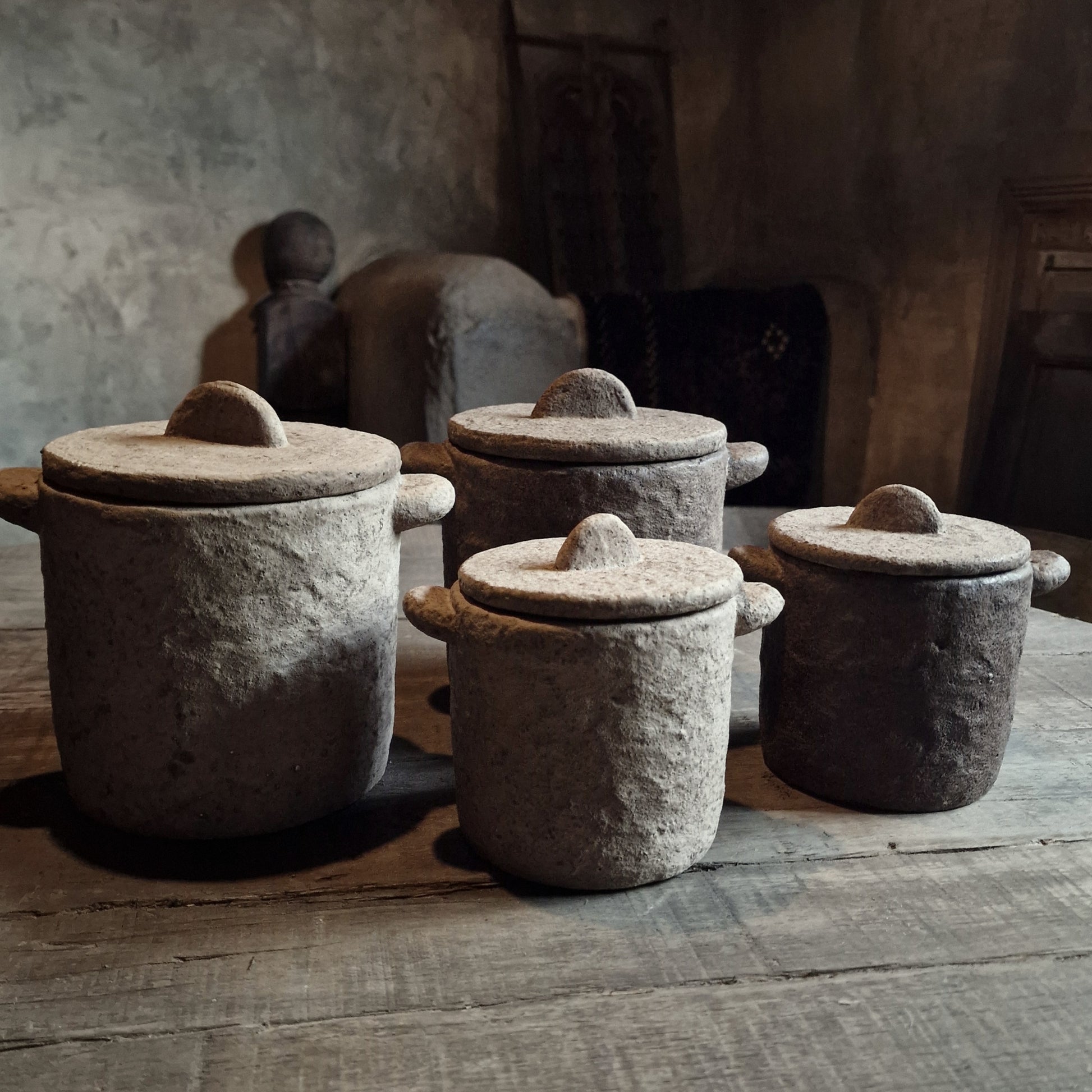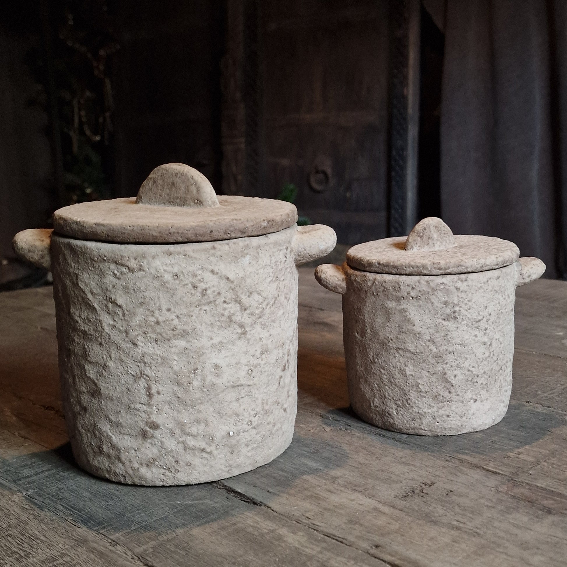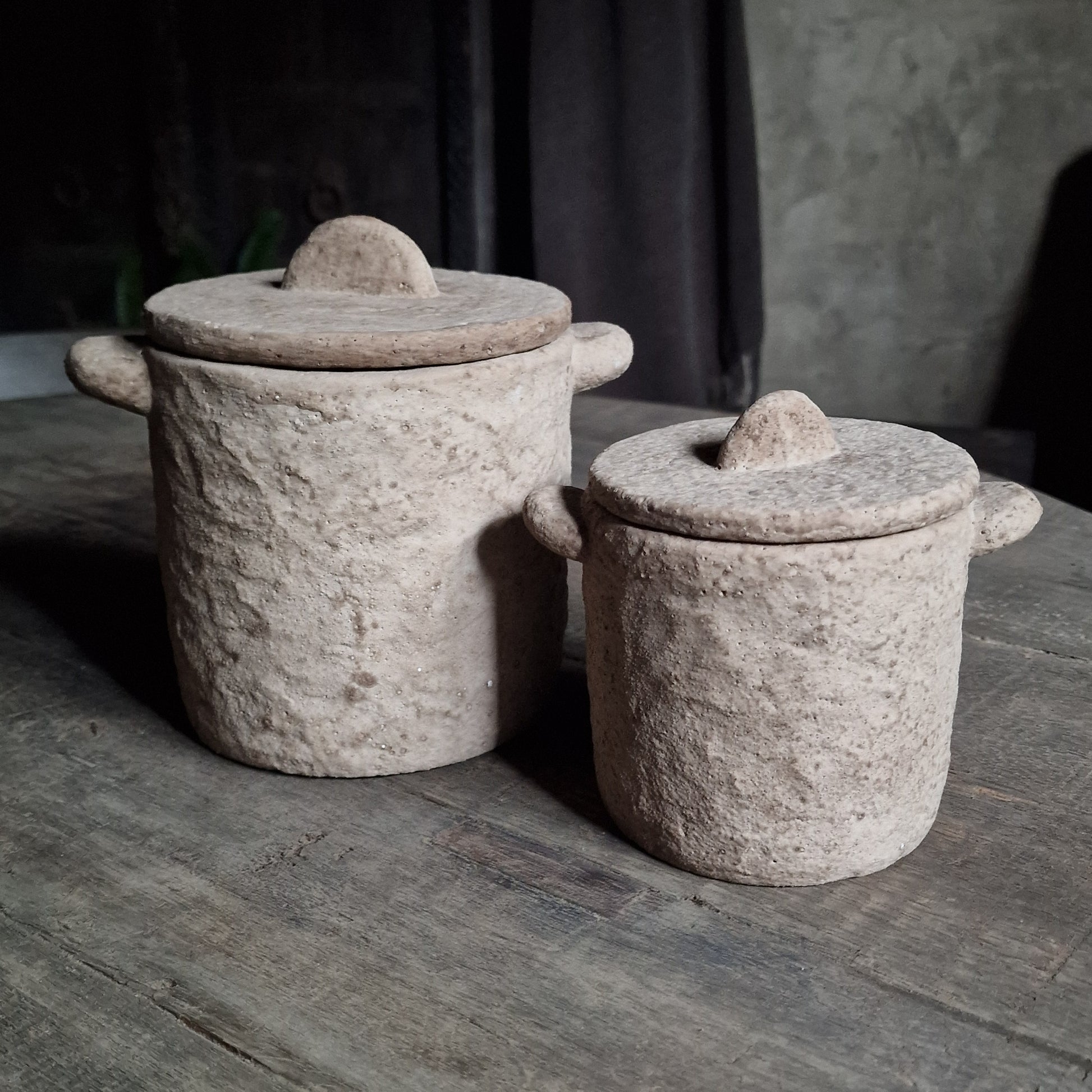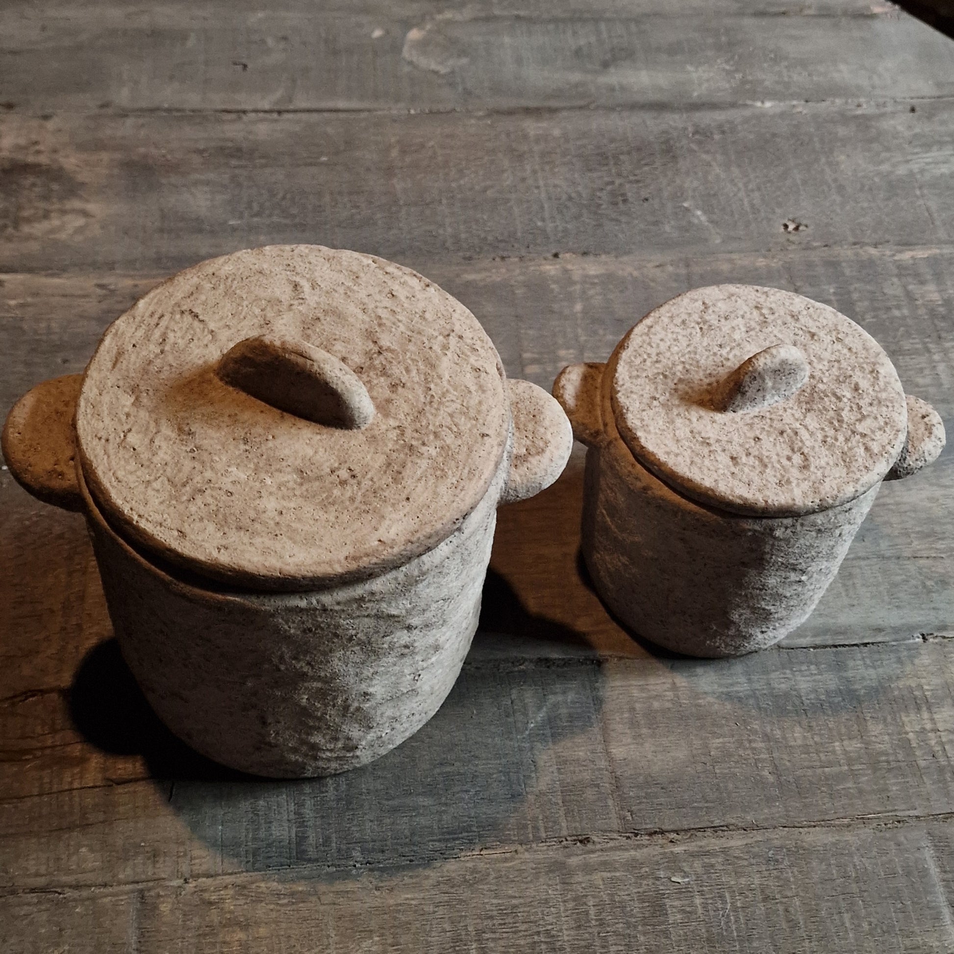 Robuuste aardewerken pot met deksel, uitgevoerd in een natuurlijke, doorleefde leem tint.
