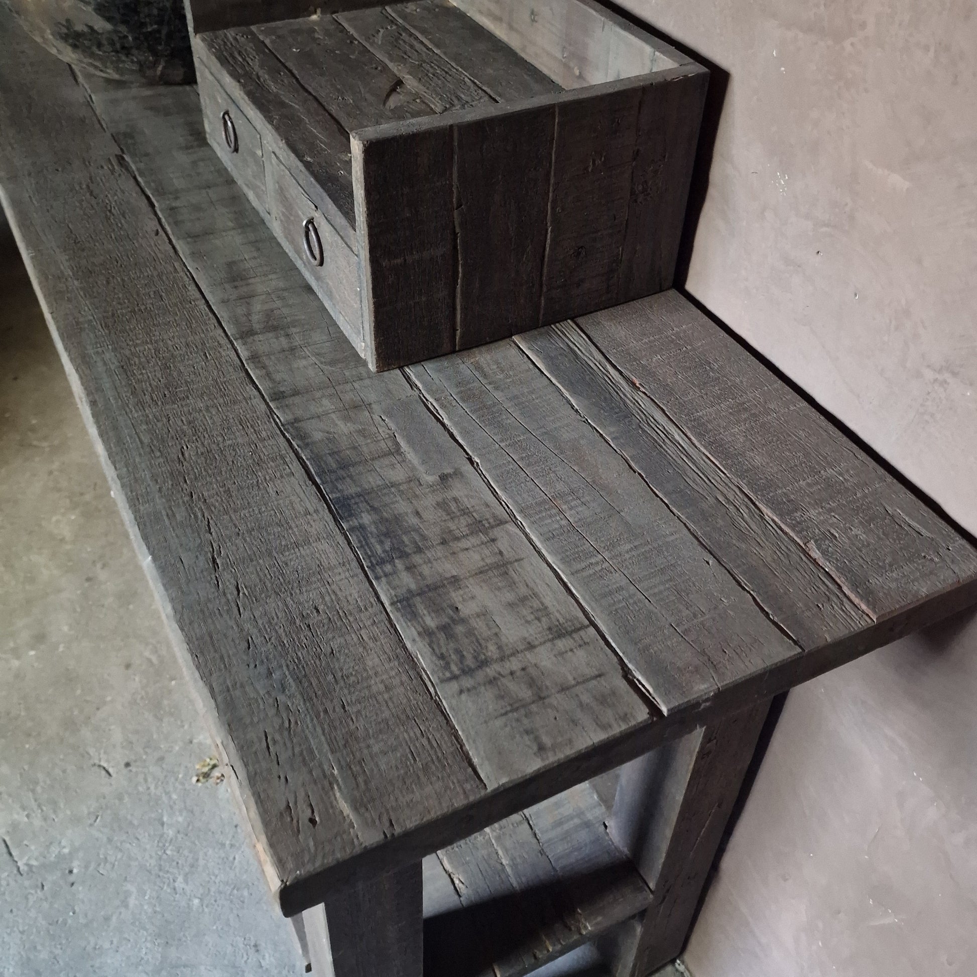 Prachtige driftwoof sidetable met 2 lades en onderplank