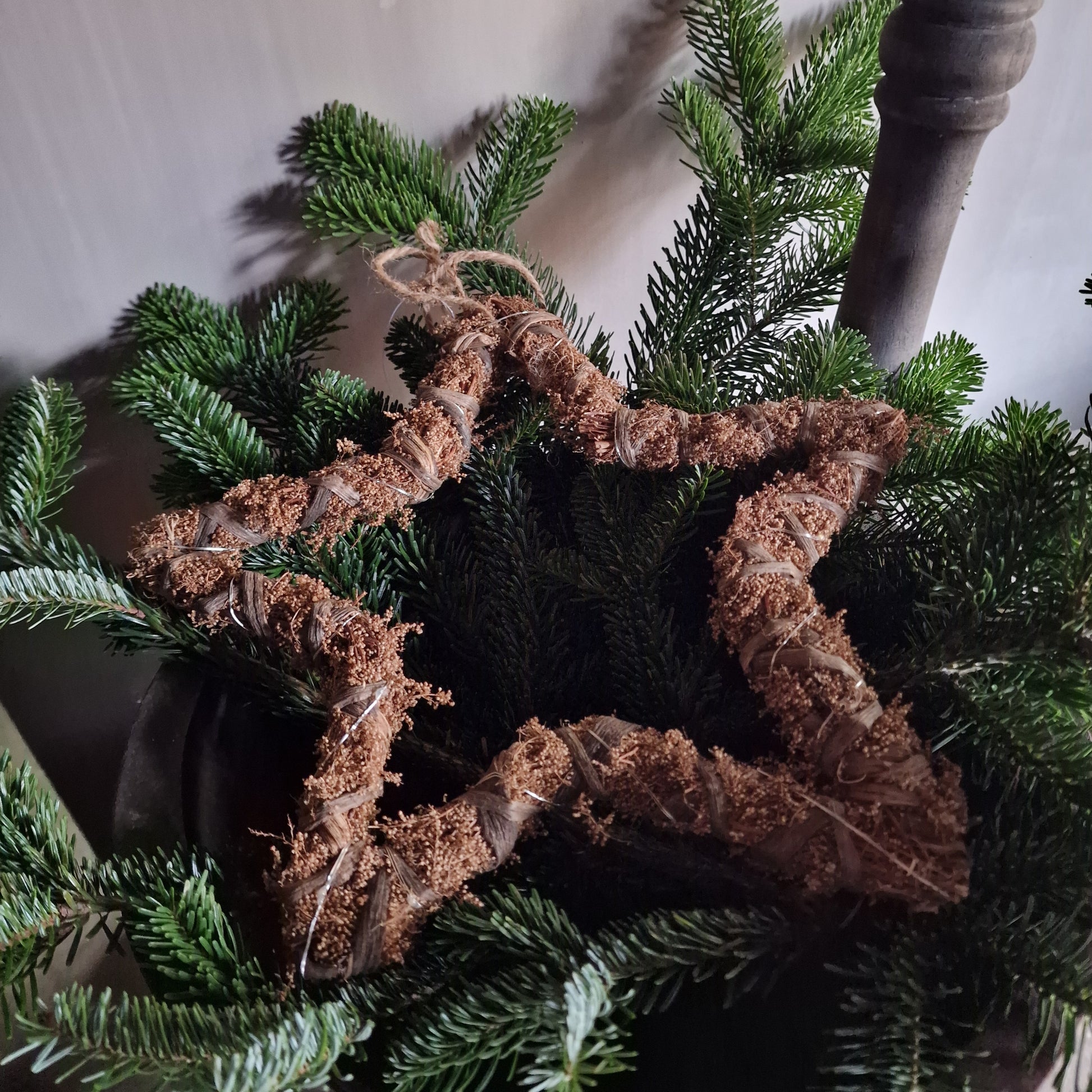 Ster omwikkeld met natuurlijk materiaal en lichtjes.