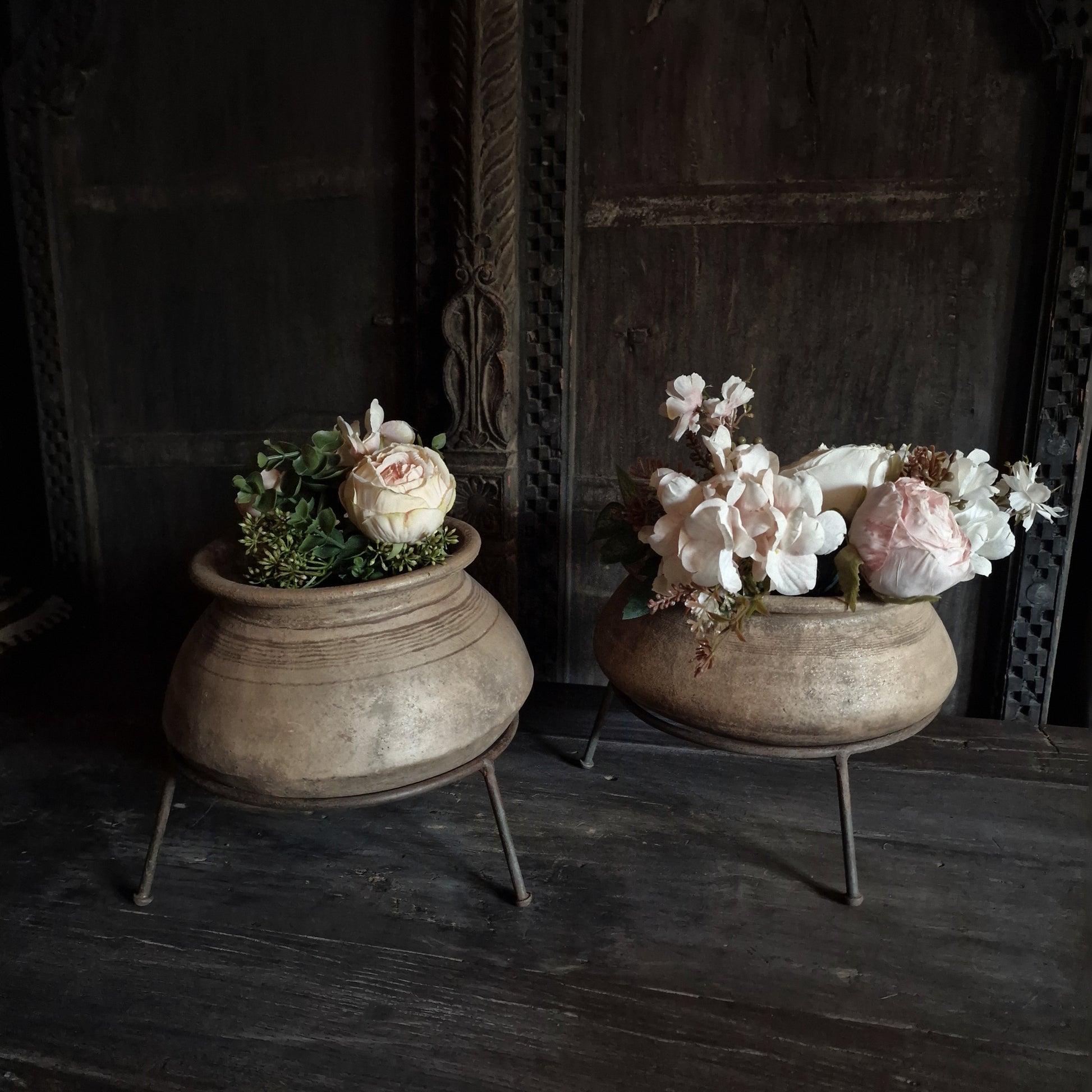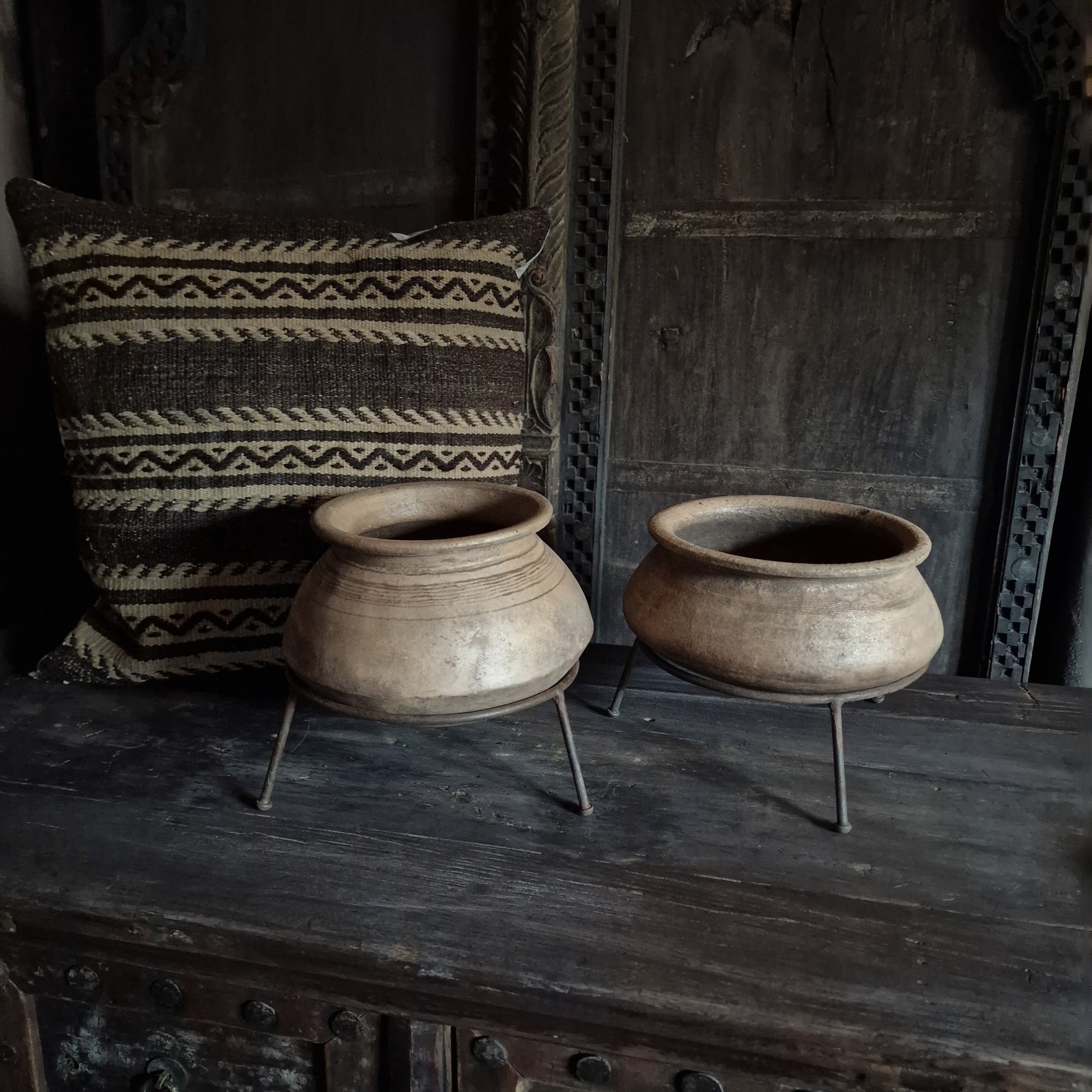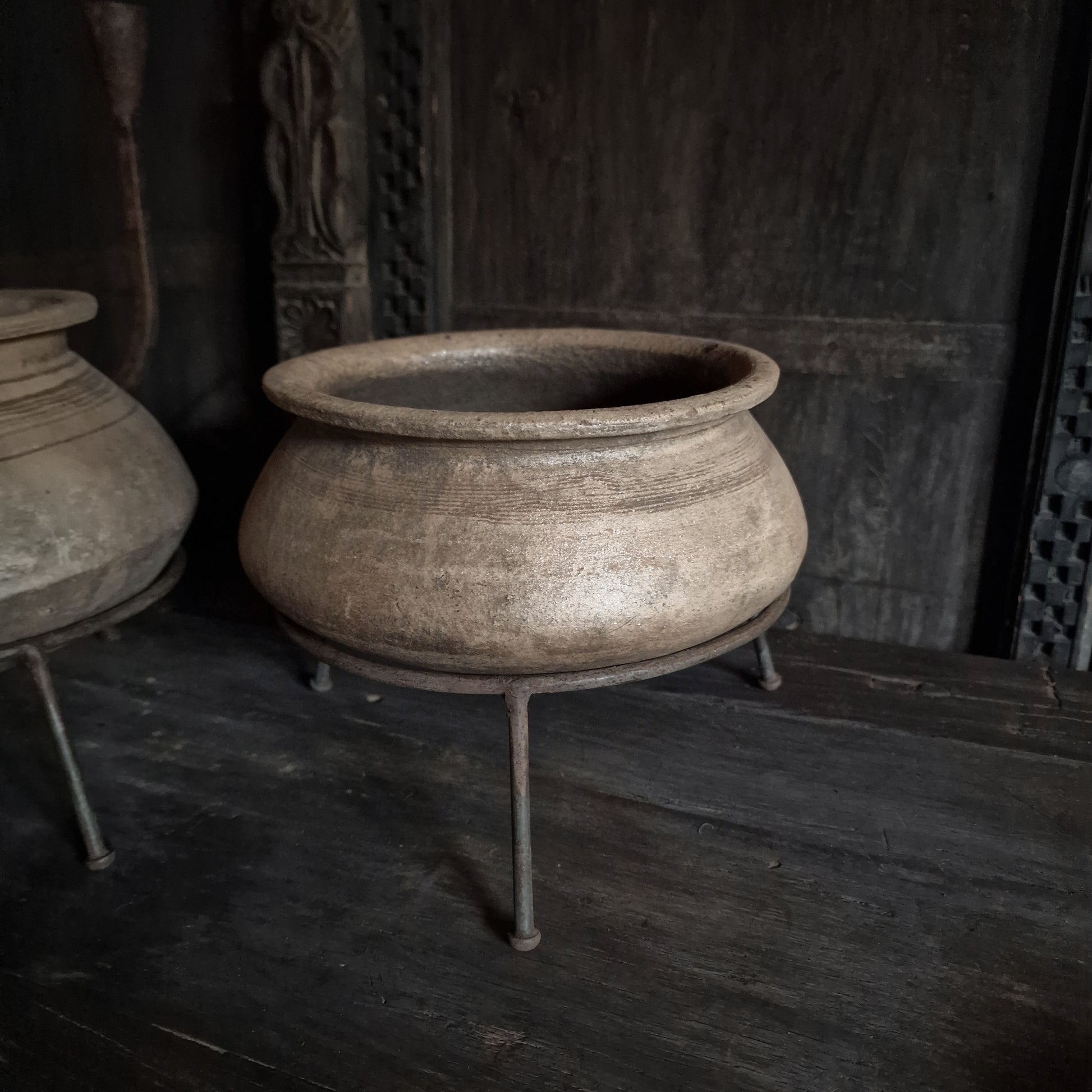 Aardewerk tuimelkruikje in ijzeren ring op pootjes