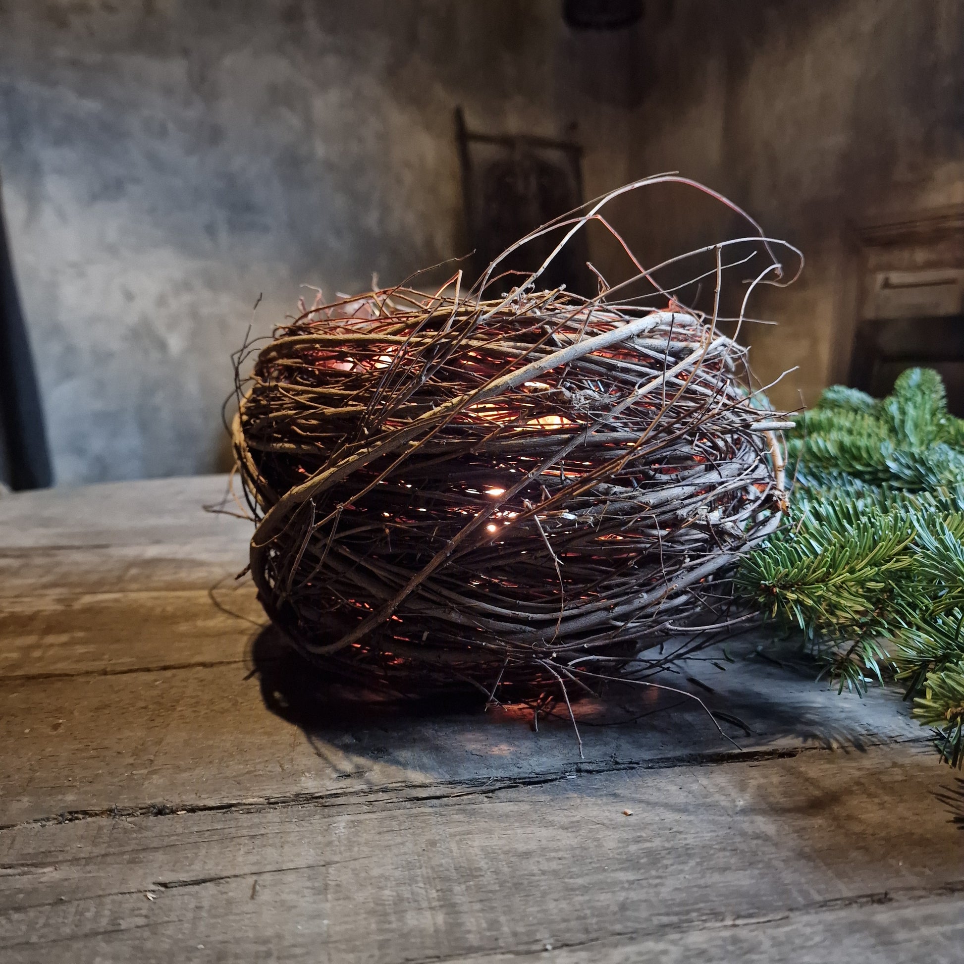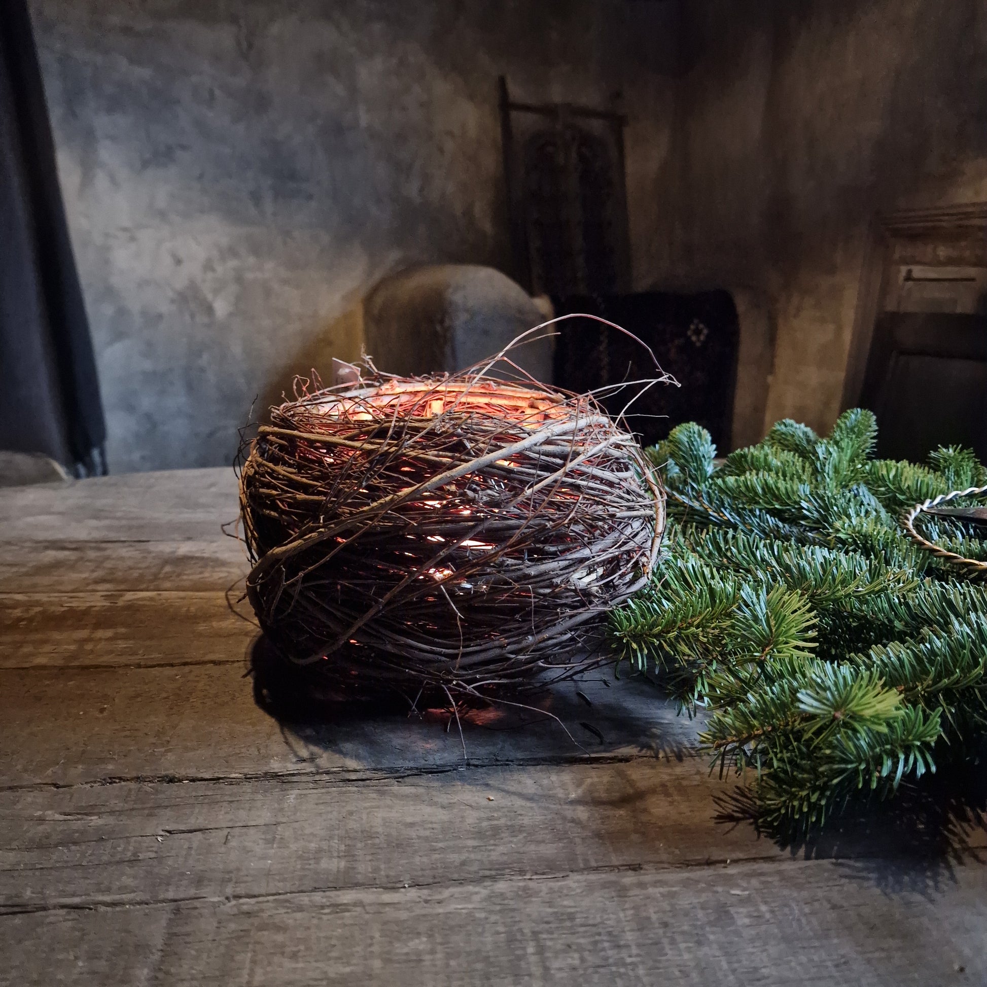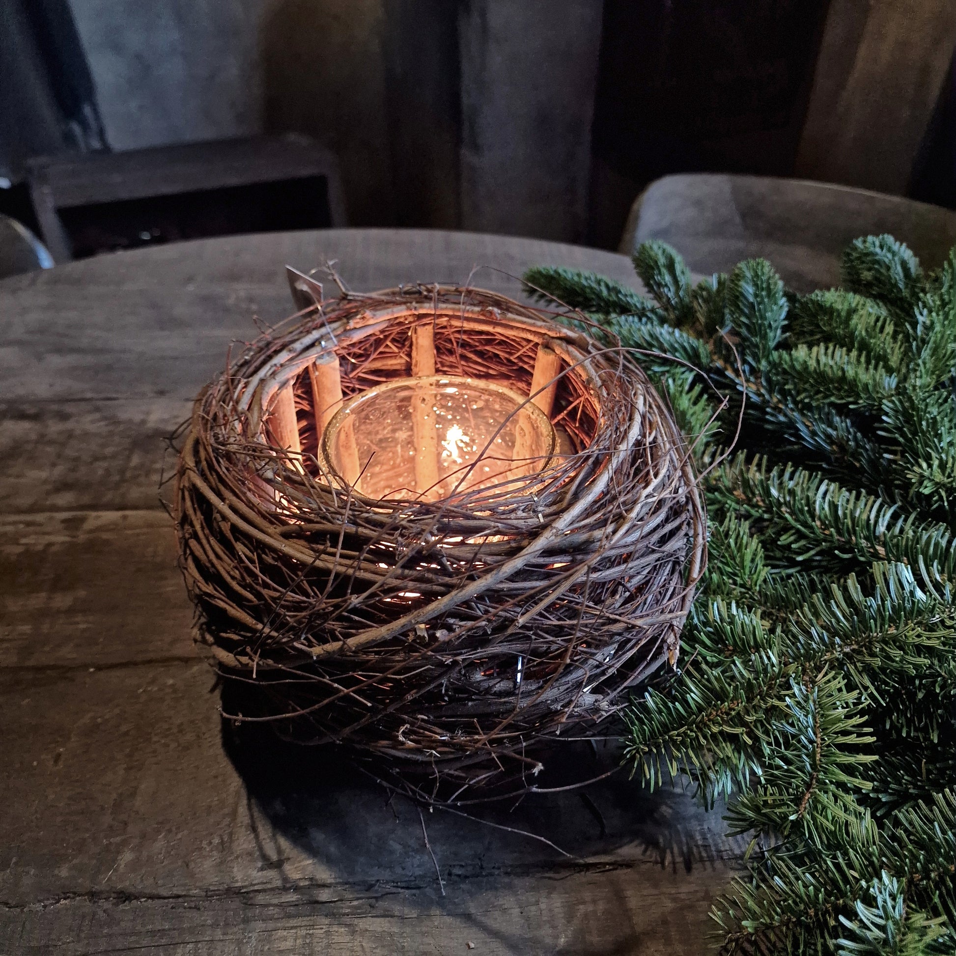 Sfeervolle windlichtcover met bodem van natuurlijke takjes, met warm licht dat subtiel tussen het vlechtwerk doorschijnt.